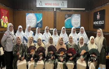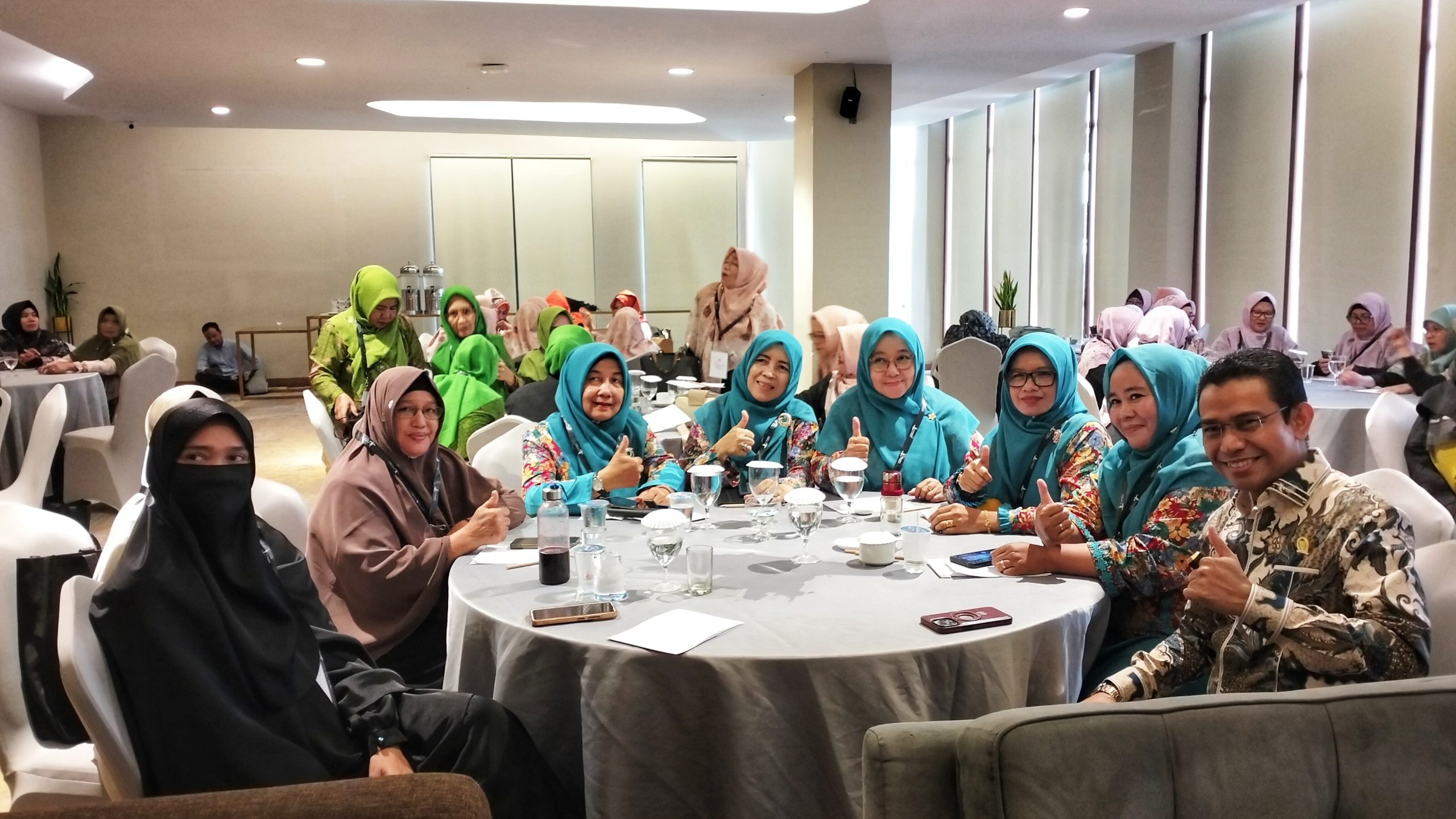 Lima orang utusan PW BKMT Riau memakai jilbab biru dan baju kurung Melayu berpose bersama Hendry Munief (paling kanan), anggota MPR RI.